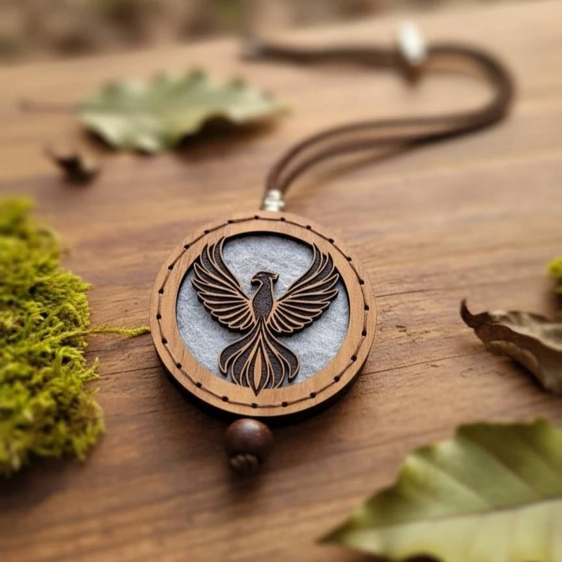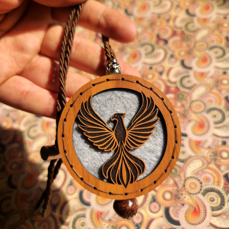 این آویز از چوب طبیعی ساخته شده و با حکاکی لیزری ظریف نقش ققنوس بر روی آن ثبت شده است. دوخت دستی دورکار، علاوه بر استحکام، به محصول جلوهای خاص و دستساز میدهد.